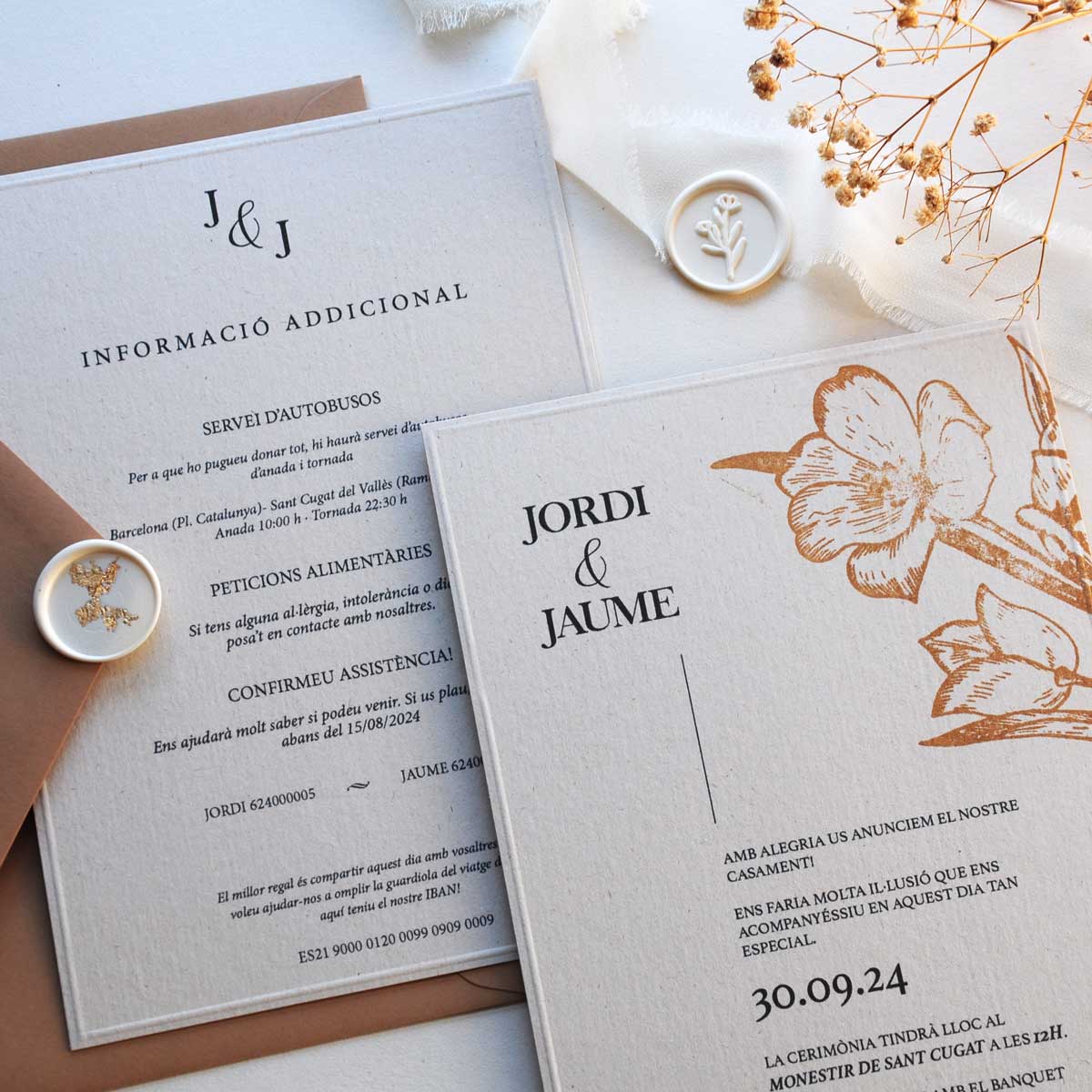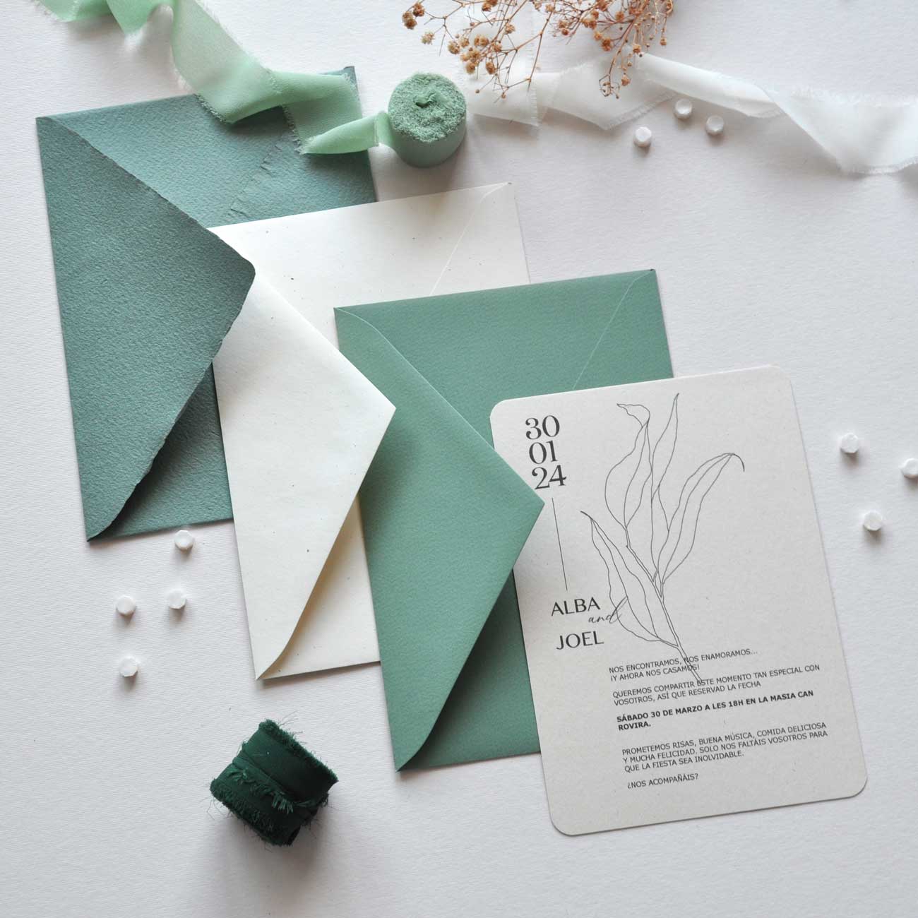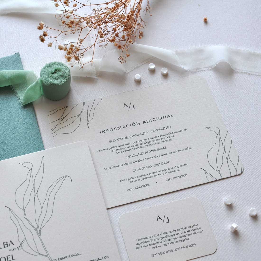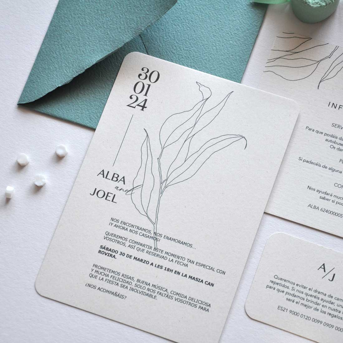 Está impresa en papel reciclado de maíz, un soporte especial y natural que aporta textura, calidez y un toque consciente para parejas que aman el planeta y los detalles con alma. Perfecta para decir “nos casamos” con un mensaje limpio y delicado, donde la belleza silvestre se convierte en protagonista.