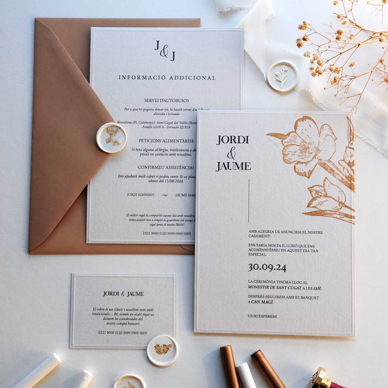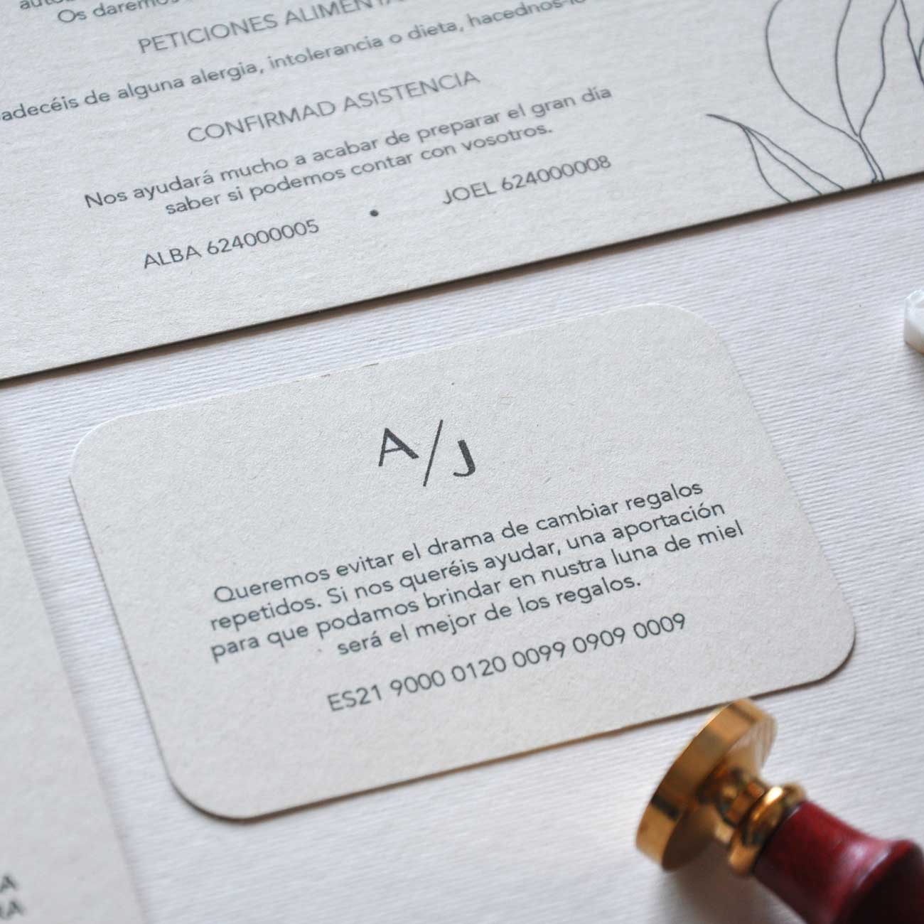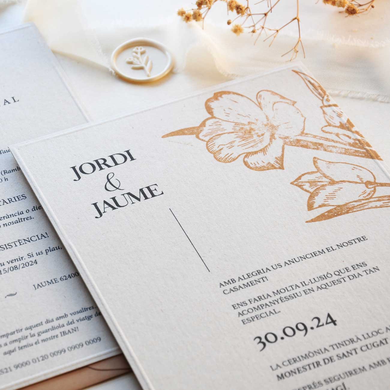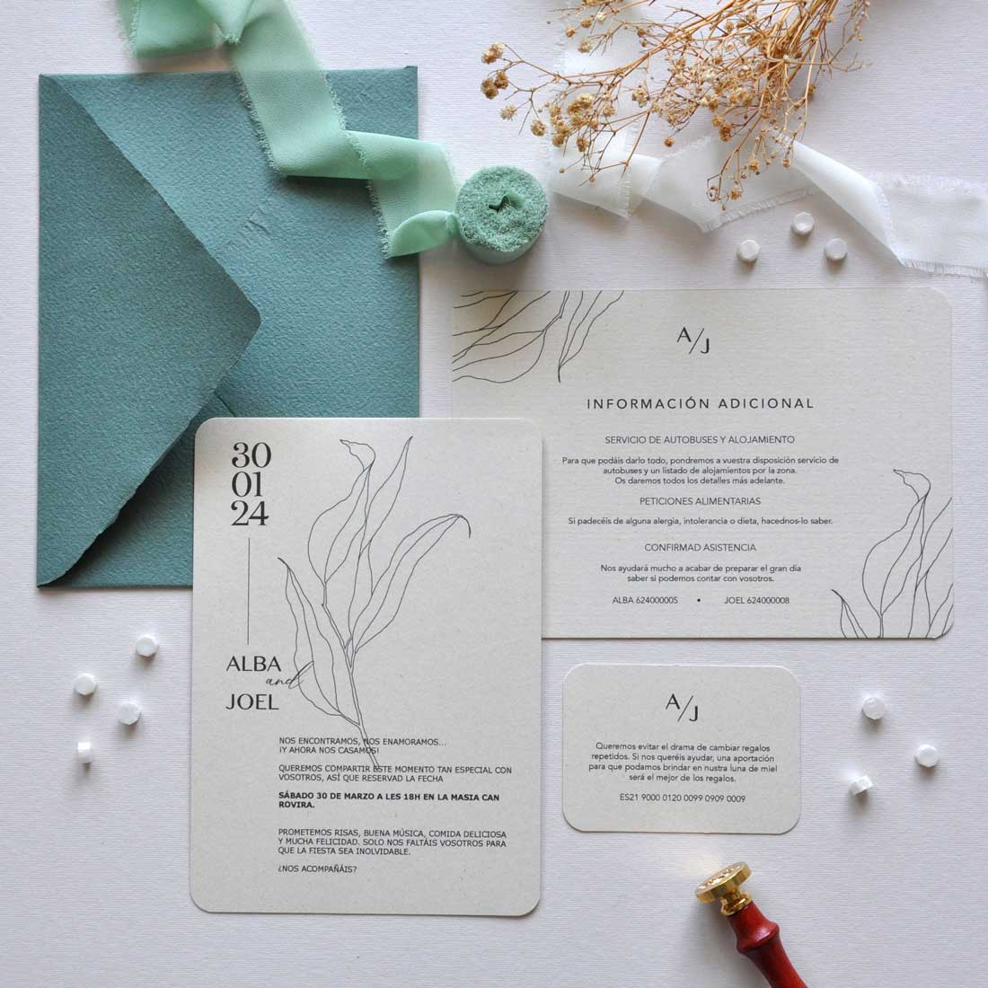 Está impresa en papel reciclado de maíz, un soporte especial y natural que aporta textura, calidez y un toque consciente para parejas que aman el planeta y los detalles con alma. Perfecta para decir “nos casamos” con un mensaje limpio y delicado, donde la belleza silvestre se convierte en protagonista.